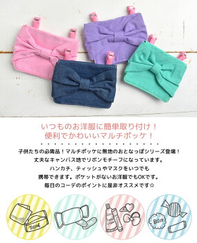 ポケットポーチ クリップ 移動ポケット 女の子 リボン ねこ耳 ネコ 移動ポッケ マルチポッケ マルチポーチ ポシェットポケット カラフル ピンク パープル ミント デニム風 通園 通学 入学 お祝い 小学生 プレゼント キッズ ハンカチ 猫耳 無地 シンプル マスク メール便OK